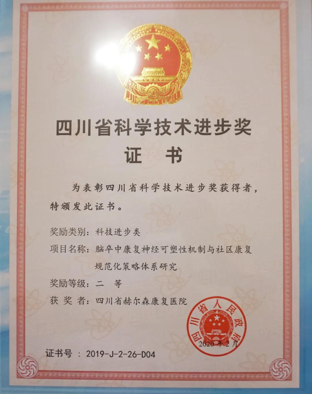 大会公布了2019年度四川省科技进步奖获奖名单,我院与四川省人民医院,成都中医药大学附属医院,西南医科大学附属医院共同开展的“脑卒中康复神经可塑性机制与社区康复规范化策略体系研究”项目荣获四川省科学技术进步奖二等奖。