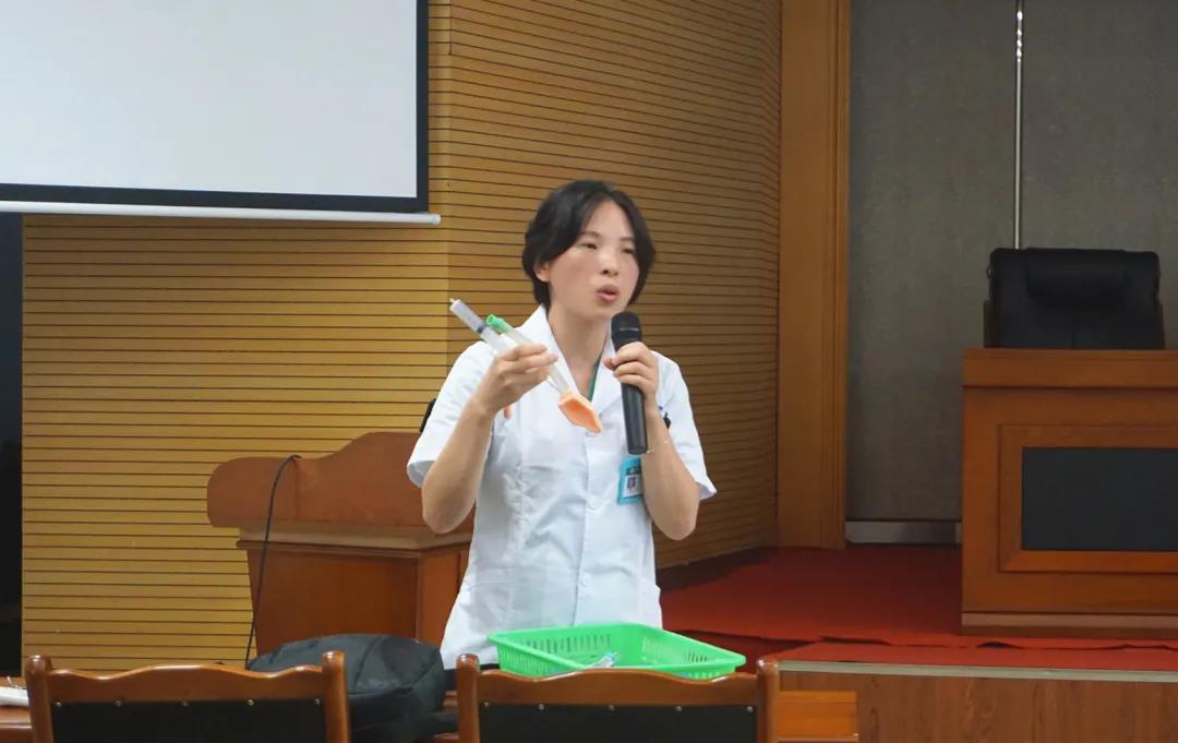 此次活动由麻醉科熊萍老师培训授课,先是对气管插管术进行详细的理论阐述,从适应症与禁忌症、物品准备、操作步骤、要点及难点以及注意事项着手,医护人员仔细听讲做好记录。随后播放了气管插管术视频,熊老师详细解说,分享了她在工作中积累的实战经验。最后对喉罩的使用进行了操作示范,使大家很快掌握操作要领。