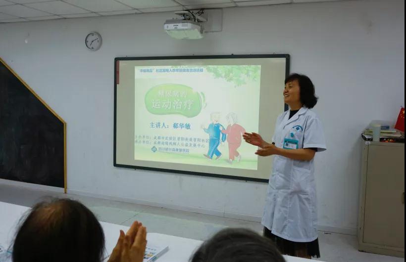 屏幕上显示今日健康讲座内容是“糖尿病的运动治疗”,主讲人为四川赫尔森康复医院内科主治医师郗华敏。